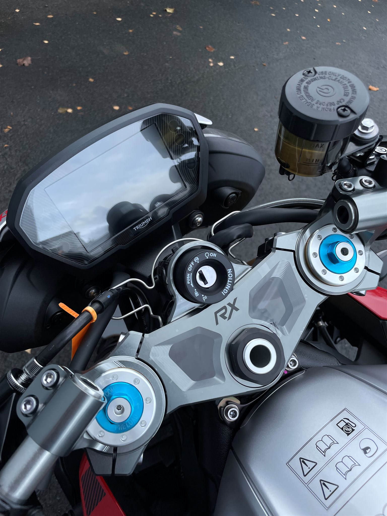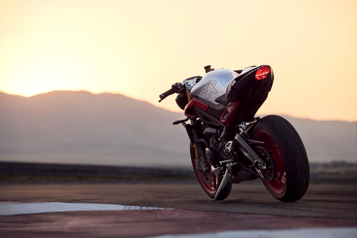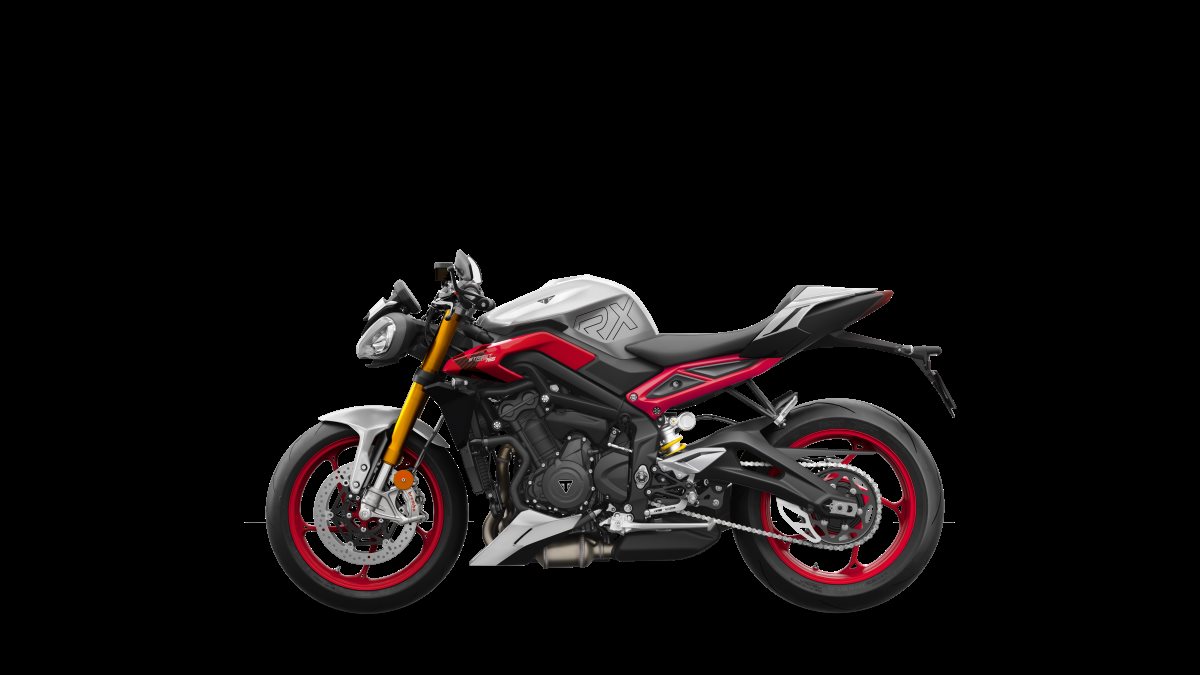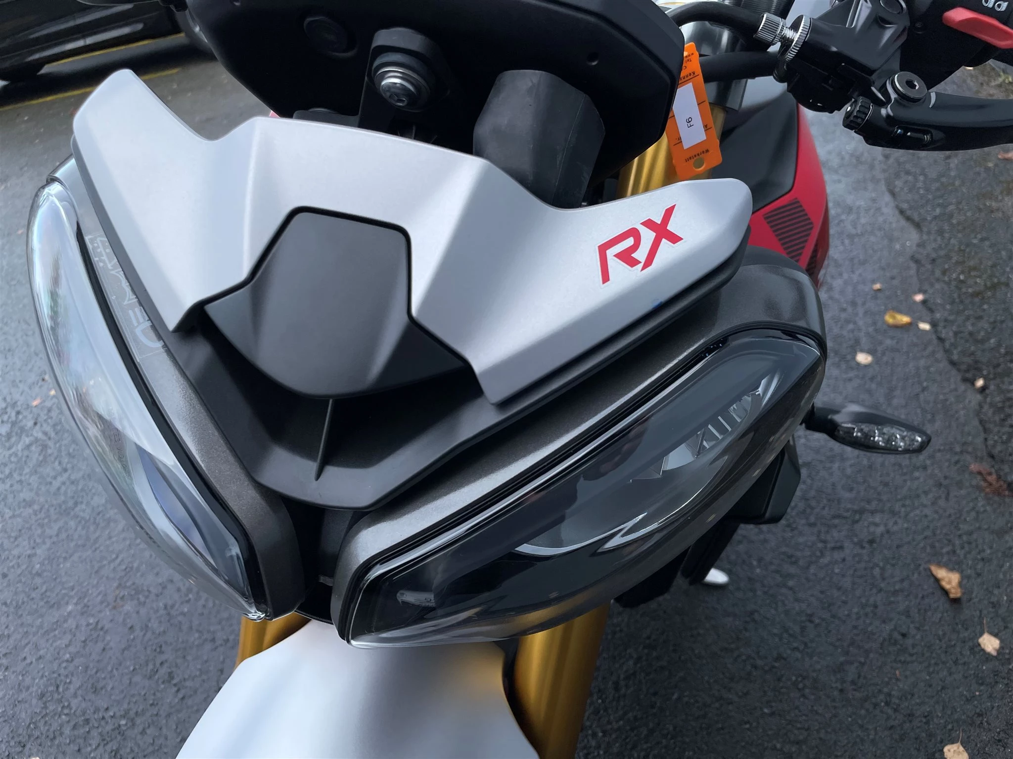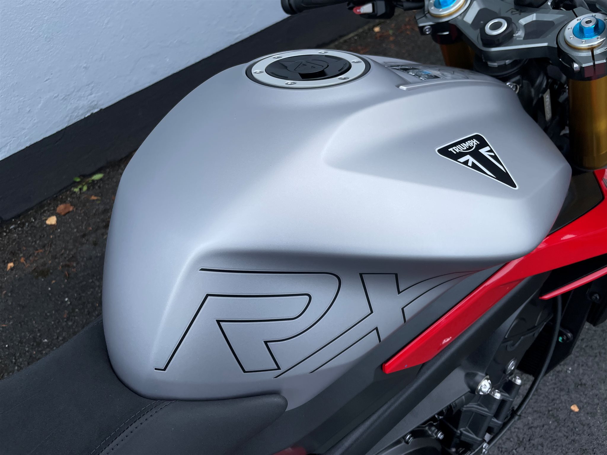 6- Gang-Getriebe mit drehmomentunterstützter Anti-Hopping-Kupplung, Triumph Schaltassistent (für kupplungsloses Hoch- und Runterschalten),ABS und Traktionskontrolle mit Track-Modus, CNC-gefräste Gabelbrücke mit Stummellenker, RX-Logo auf dem exklusiven Sitz und auf dem Endschalldämpfer.